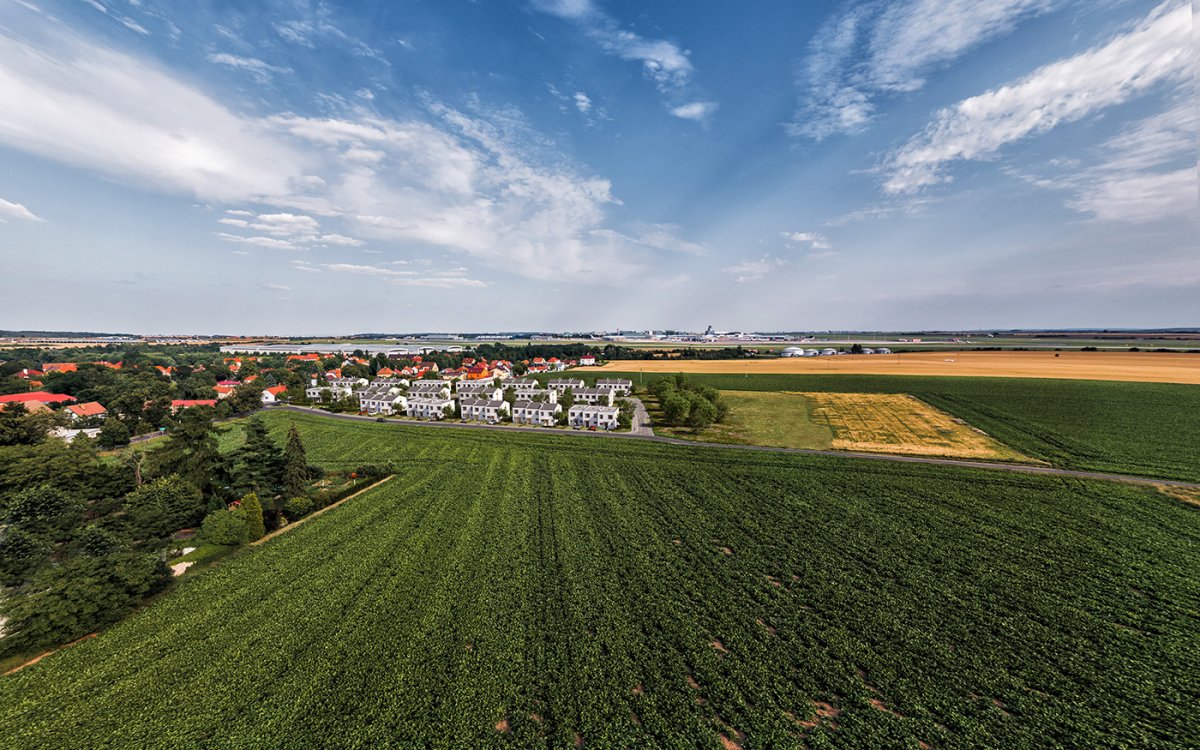 Jednou z velkých výhod Kněževsi je její poloha v těsné blízkosti Letiště Václava Havla – jen 5 minut autem. Zároveň ale díky umístění mimo letovou dráhu nelétají letadla ani drony přímo nad domy. Hluk je tak dokonce nižší než u běžné silnice v Praze.